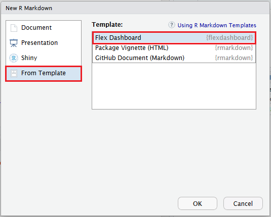 Pour créer un flexdashboard, il faut aller dans File>New file>R Markdown. Dans la barre de gauche, cliquez sur From Template puis sur Flex Dashboard et OK.