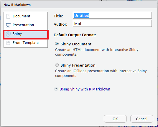 Dans la barre de gauche choisissez Shiny. Donnée un titre à votre document dans Title puis OK