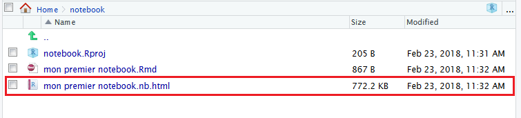 Lorsque vous enregistrez un notebook, un fichier .nb.html est créé à côté de celui-ci. Ce fichier est un fichier HTML autonome qui contient à la fois une copie rendue du Notebook avec toutes les sorties de bloc actuelles et une copie du document .Rmd lui-même.