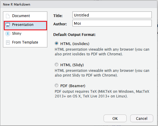 Pour créer une présentation : File>New File> R Markdown. Dans la barre de gauche, cliquez sur Presentation_. Donnez-lui un nom puis OK.
